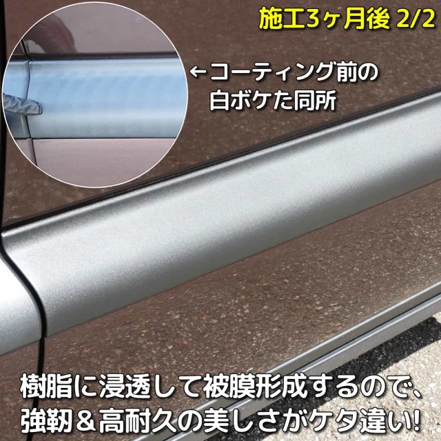 さらに汚れや劣化などによっても状態が変化するため、すべての樹脂パーツで画一的なコーティング効果・耐久を発揮させることは、他のコーティング以上に困難といえます。